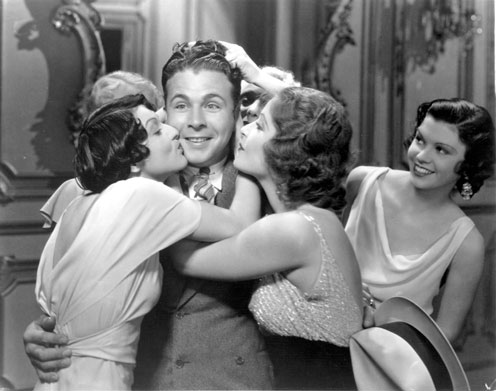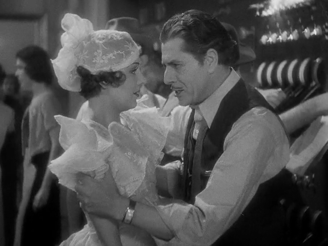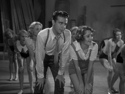 By today standards, the text is insipid, corny, and even banal. Warner Baxter as the Broadway producer-director (with heart troubles) who makes the memorable and much satirized speech: “You’re going out a youngster, but you’ve got to come back a star! Bebe Daniels is the fading star (in fox furs) that breaks her ankle, and George Brent is her lover. Dick Powell is the singing and smiling twerp juvenile. Ginger Rogers, as Anytime Annie, is the gold-digging chorine, known as the countess, and Guy Kibee is the sleazy sugar daddy. One can also spot in the chorus Una Merkel and Toby Wing.