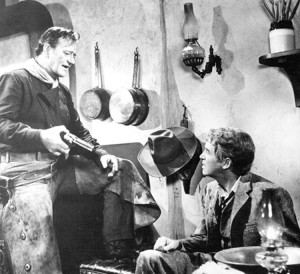 Stewart’s lawyer is at first reluctant to use violent force in defeating Liberty Valance. Gradually, however, he comes to accept Wayne’s code as the only appropriate behavior in the Wild West, that is, that force should be used to meet force. But Stewart is no good at shooting and Wayne has to instruct him, at Hallie’s (the woman they both love) request. Wayne’s sharp lesson is done in semi-humorous, semi-sarcastic manner, making a fool out of Stewart by puncturing paint tins used as targets. Humiliated, Stewart angrily knocks Wayne to the ground, demonstrating first steps in adjusting to the mores of the West.